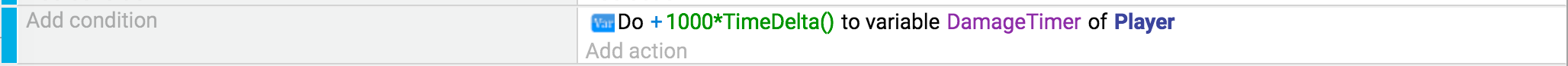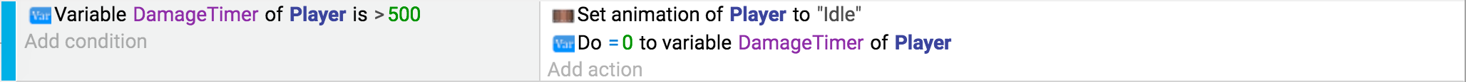 Por ejemplo, como se ve a continuación, puede comparar una variable (temporizador de daño) para configurar una acción después de 0,5 segundos. Entonces el "temporizador se puede reiniciar.