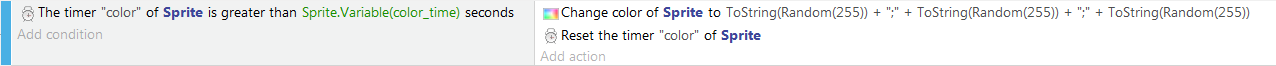 La condición anterior verifica si el tiempo transcurrido en el temporizador "color "es mayor que una variable de objeto (puede usar una variable de objeto en una expresión para obtener su valor). La condición seleccionará cada instancia de Sprite con un valor de temporizador mayor que el tiempo "solicitado" con la variable de objeto "color_time ". Luego, el color del Sprite se cambia a uno aleatorio y el temporizador del objeto se restablece.