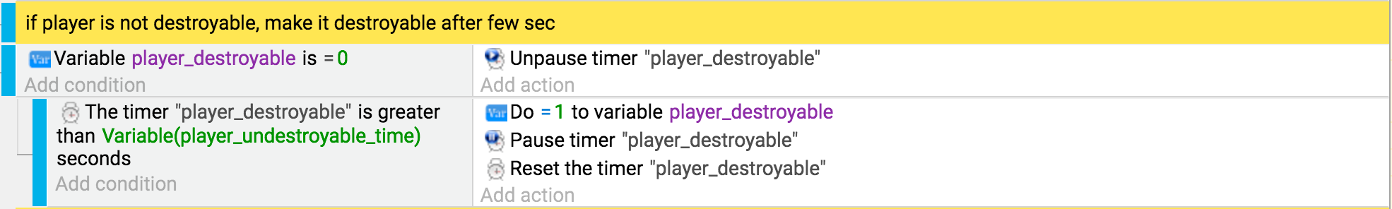 Aquí hay un ejemplo de Timer más avanzado. El temporizador se utiliza para proteger brevemente al jugador de daños. La cantidad de tiempo otorgada para proteger al jugador depende del valor de la variable "player_undestroyable_time "