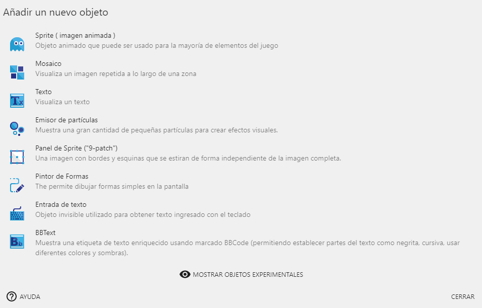 Diferentes tipos de objetos proporcionan características específicas. Para la mayoría de nuestros objetos, utilizaremos los objetos Sprite, que son objetos animados que se pueden usar para muchos elementos (jugador, plataformas, enemigos, elementos ...).