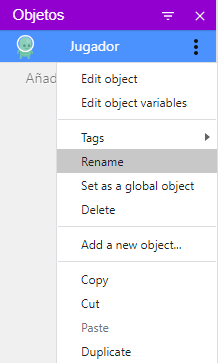 Para que sea más fácil referirse a nuestro objeto, asígnele un nombre en lugar de usar el nombre predeterminado. Haga clic derecho en él (o haga clic en el ícono ) y elija renombrar. Luego puede escribir "Jugador" y hacer clic en cualquier lugar de la pantalla o presionar la tecla Intro para cambiar el nombre del objeto.