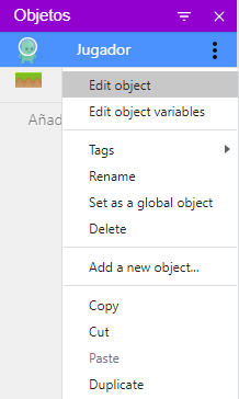 Abra el editor de objetos "Jugador":