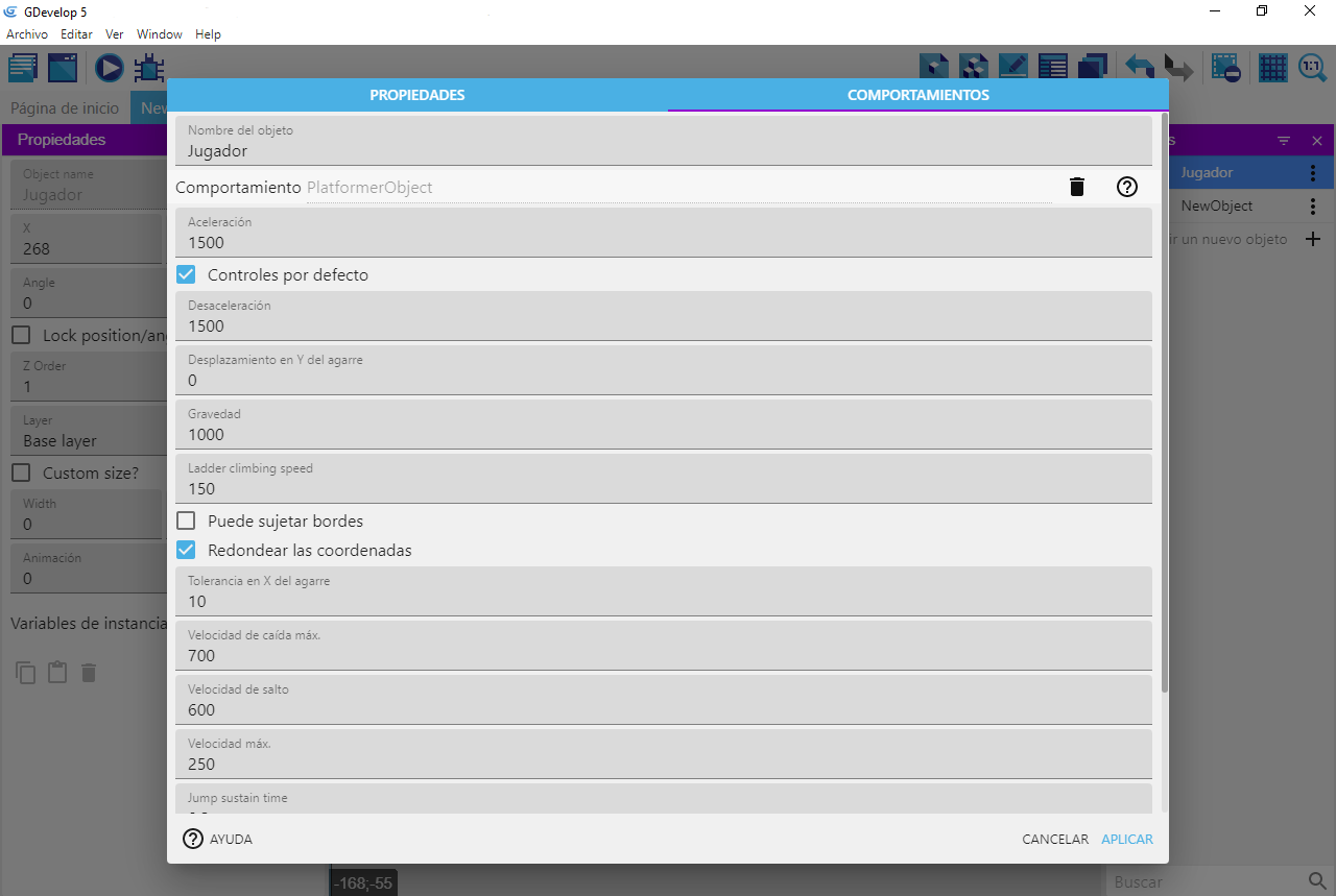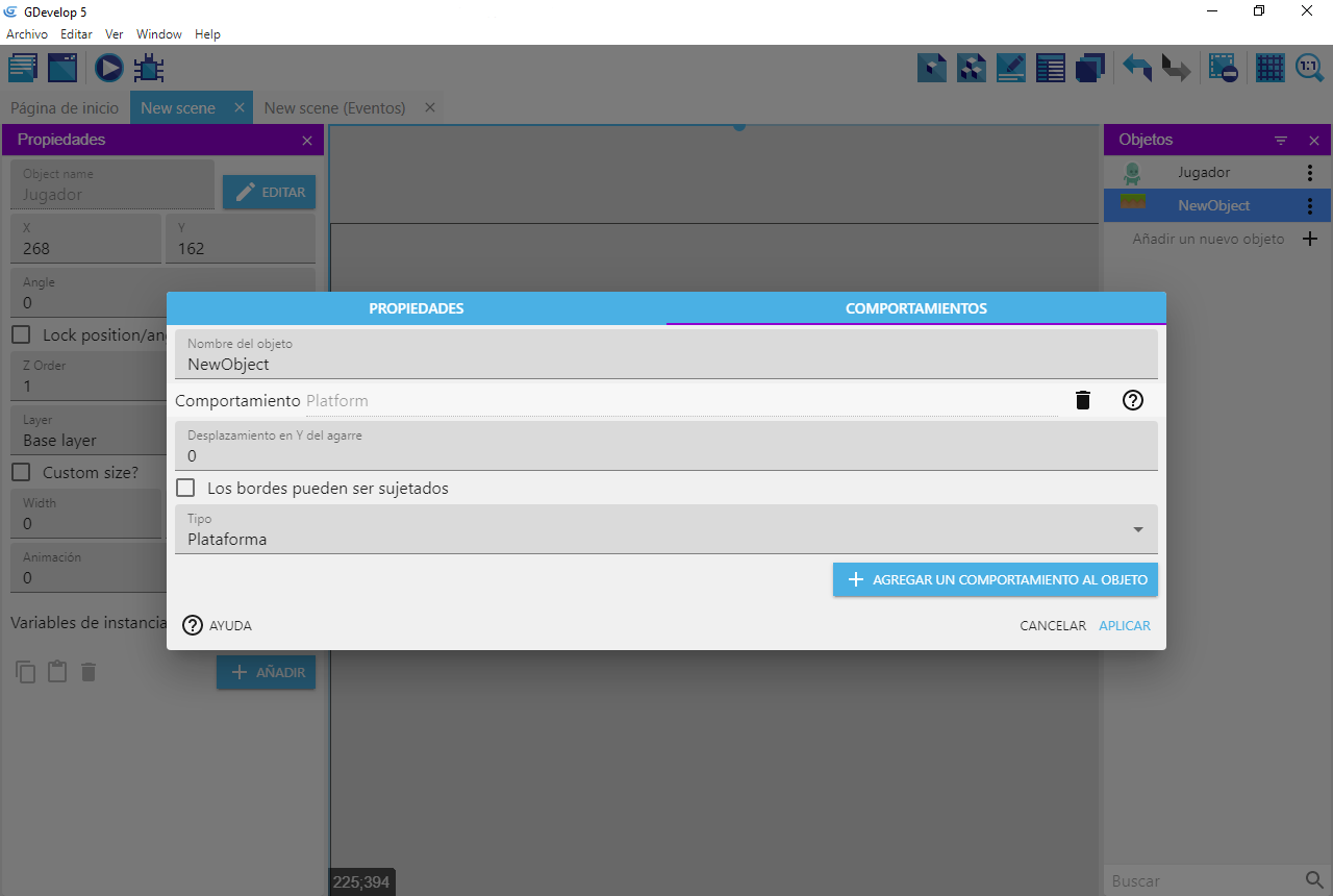 El movimiento del jugador podría crearse usando los eventos de GDevelop, pero sería una tarea bastante larga y difícil recrear un buen motor de plataformas. Afortunadamente, GDevelop ya viene con un motor de plataformas completo incorporado que podemos usar. Para esto, necesitamos usar los "comportamientos de las plataformas", que nos permiten acceder y utilizar el motor de plataformas integrado.