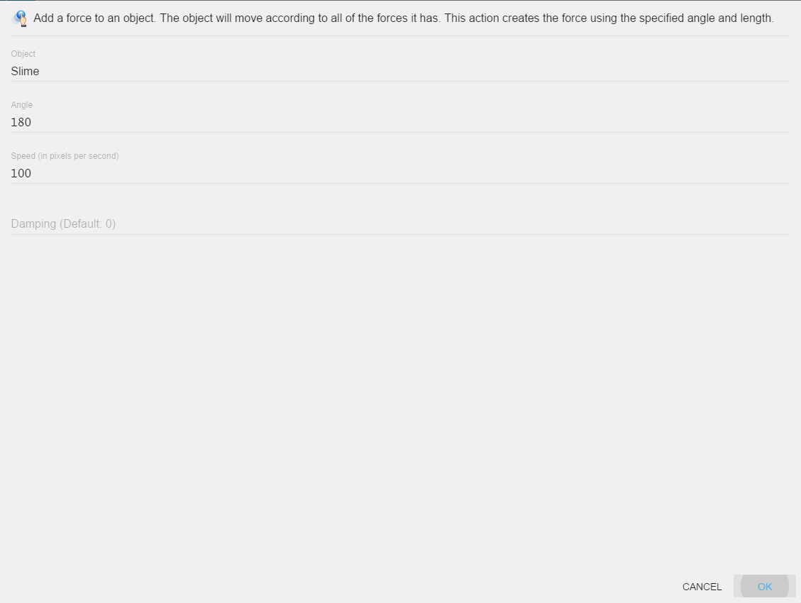 En los parámetros, para el campo de objeto, seleccione "Limo" de nuevo. Para el ángulo, ingrese "180" grados (que es el lado izquierdo en el sistema de coordenadas GDevelop) y para velocidad ingrese 100.
