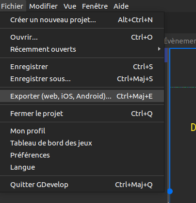 Publier votre jeu sur Android ou iOS GDevelop permet de publier vos jeux sur plein de platformes différentes, y compris Android et iOS avec les services d'empaquetage ou manuellement. Pour exporter un jeu, cliquez/sélectionnez 'Fichier" depuis le menu qui se trouve en haut de l'interface GDevelop. Choisissez l'option d'export que vous voulez. Dans ce cas, nous allons choisir Android et iOS depuis le panneau des options d'export.