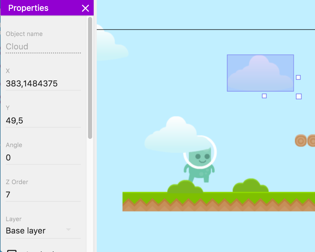 Vous pouvez maintenant changer le z order des buissons et des nuages en leur donnant des valeurs négatives de manière à ce que le personnage du joueur (dont le z vaut 1 puisque c'est le premier objet placé sur la scène) soit toujours affiché devant les autres objets.