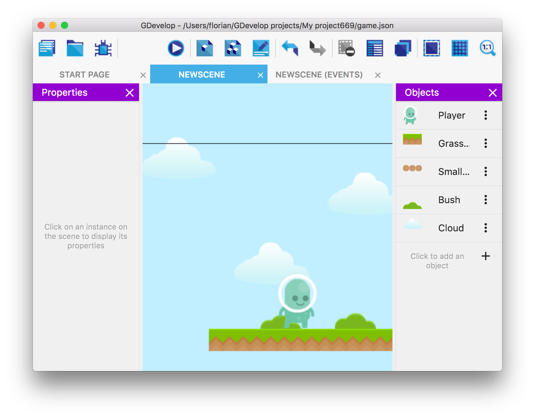 Ajoutez quelques nuages dans le ciel et deux ou trois buissons sur la plateforme. Vous pouvez constater que la joueur est affiché derrière les objets ajoutés.