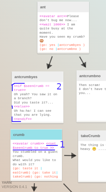 Apart of the commands you can set up for yourself, and the ones built into the extension, yarn's parser library - bondagejs comes with a few very cool built in ones that can be used to store information and use it to conditionally show text to the user. So lets say your player visits a dialogue branch of an item once and has read it. Then having that information, the player starts a conversation with a npc.