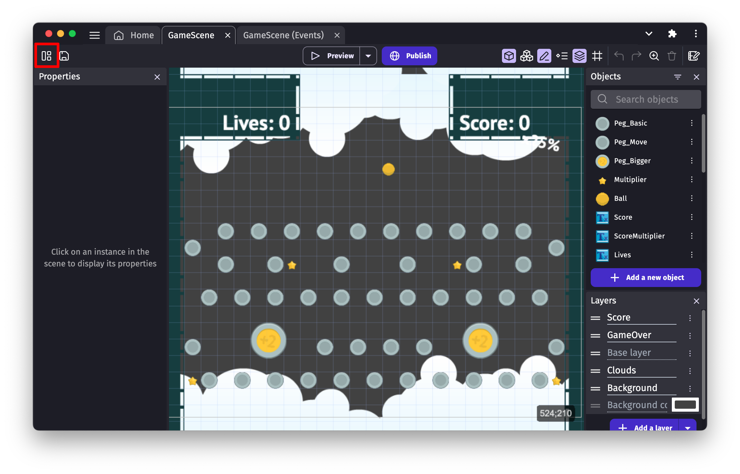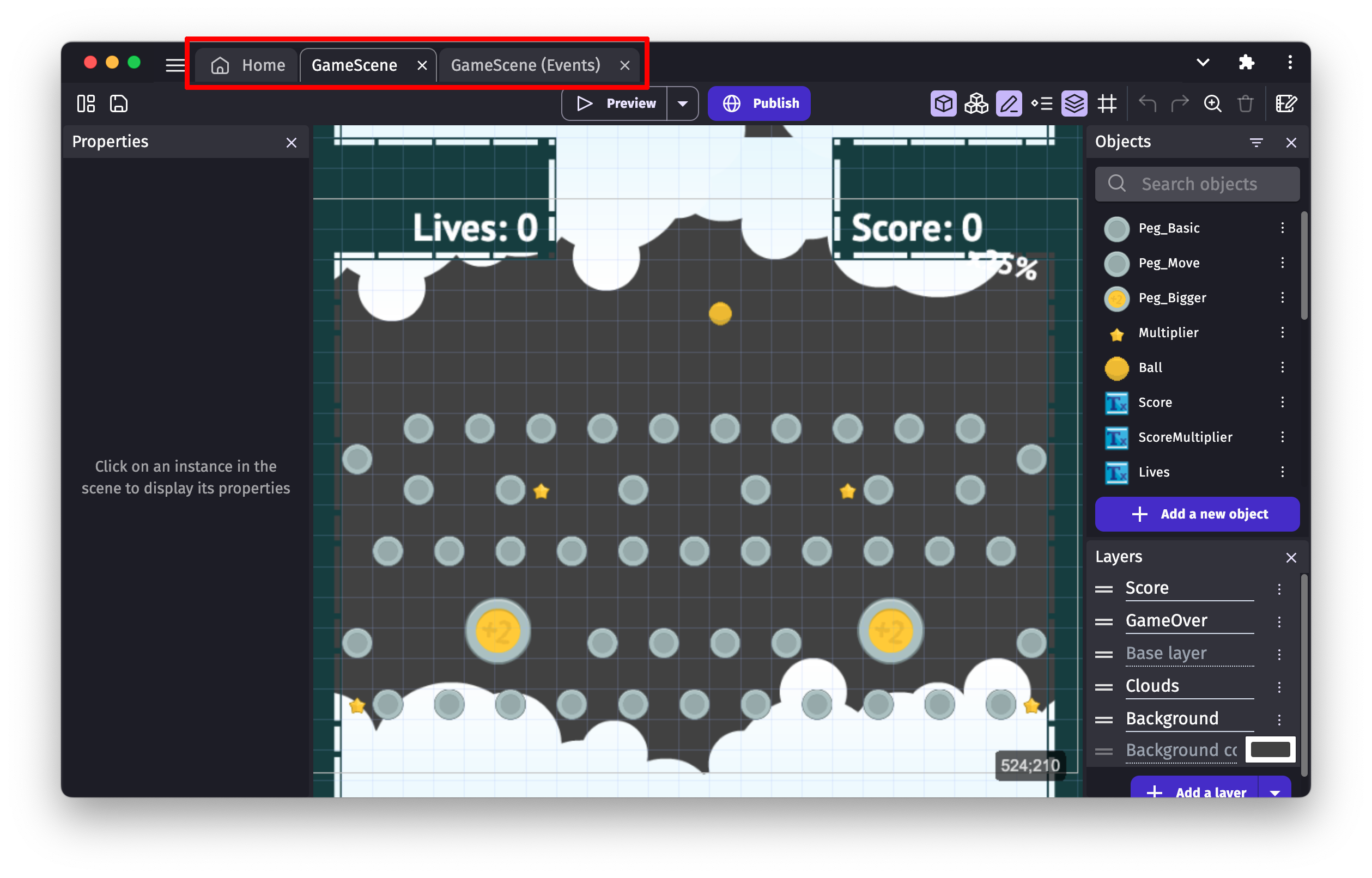 The working interface of GDevelop is based on editors that are displayed in tabs. These editors allow you to change different parts of your game.
