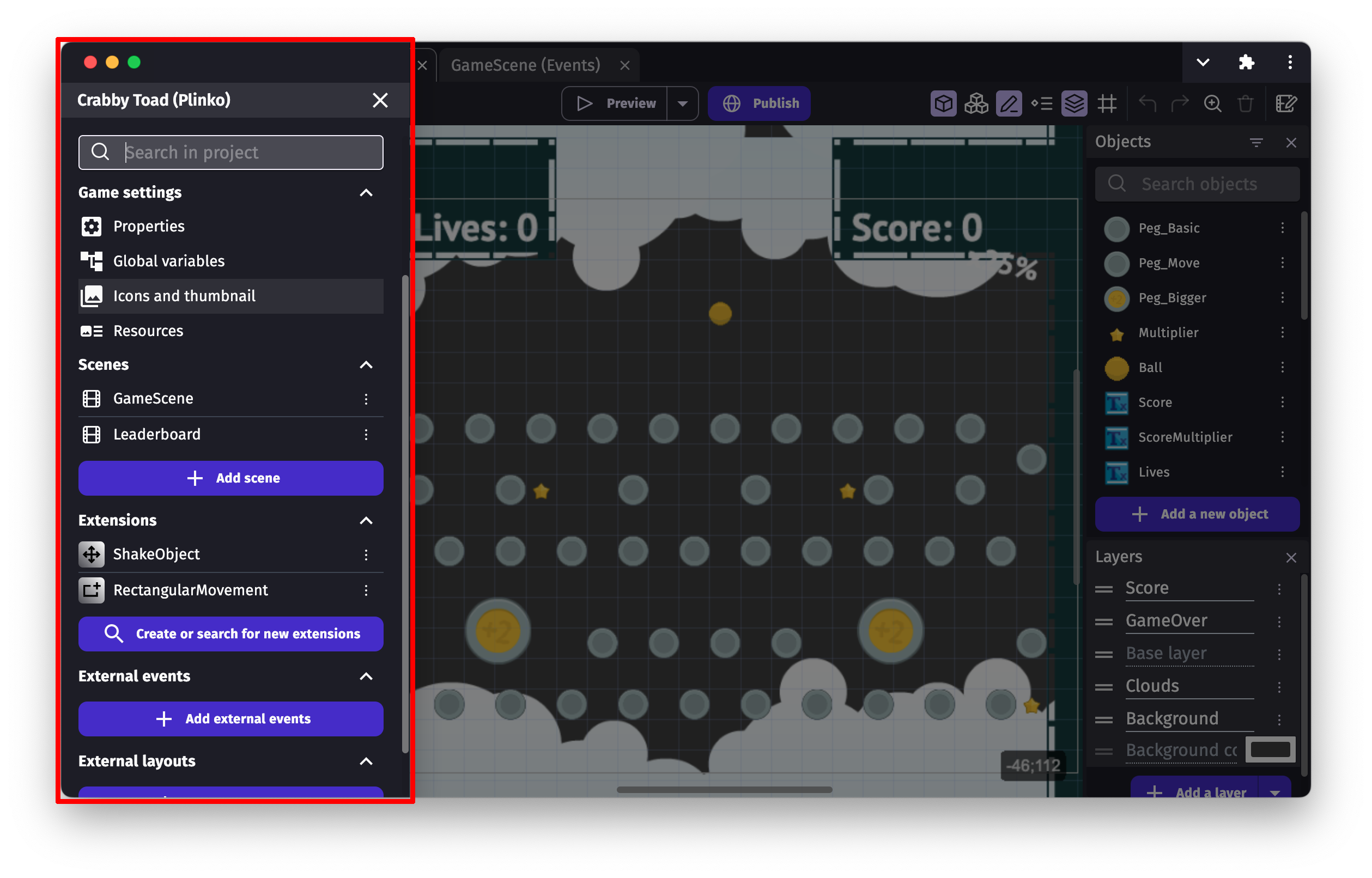 Using the project manager, you can add new elements to your game and open editors. Learn more about the content of the project manager here.