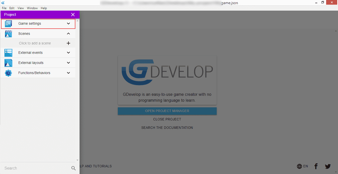 After clicking the "Create project" button we are presented with the new project, and the "Project" window should appear on the left panel. From there, select "Game settings" to enter basic configuration for our game.