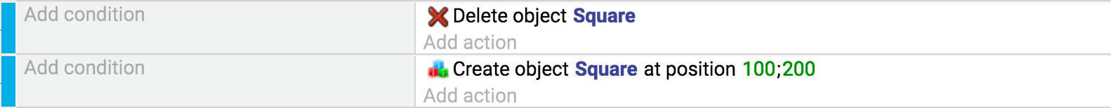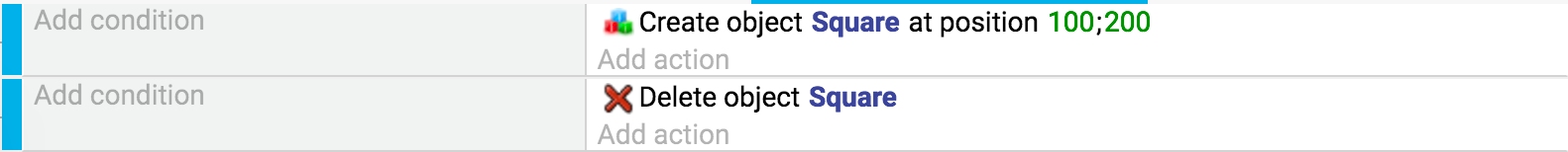 • O segundo par de ações de eventos exclui todos os objetos "Square" da cena/tela. Em seguida, cria um "Square" nas coordenadas da cena / tela X: 100, Y: 200 (100; 200). Este evento mostra que um quadrado é visível na cena (antes de ser excluído no próximo quadro. Ele será recriado imediatamente).