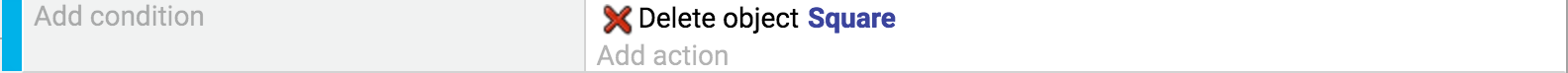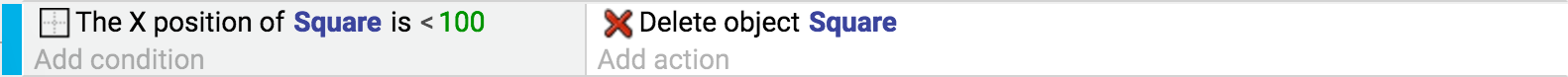 O evento abaixo tem uma condição. Ele excluirá apenas os objetos "Square" com uma posição X menor que 100 pixels: