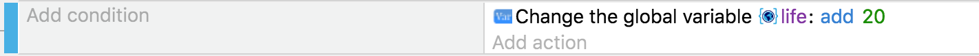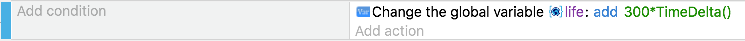• O primeiro evento adiciona 20 à variável toda vez que o jogo é atualizado (ou seja, o máximo possível, até 60 vezes por segundo). Não é correto usar esse evento, pois a velocidade de aumento da variável não será a mesma de computador para computador: não podemos prever o valor da variável após 10 segundos, por exemplo - pois depende do número de quadros do jogo pintado.